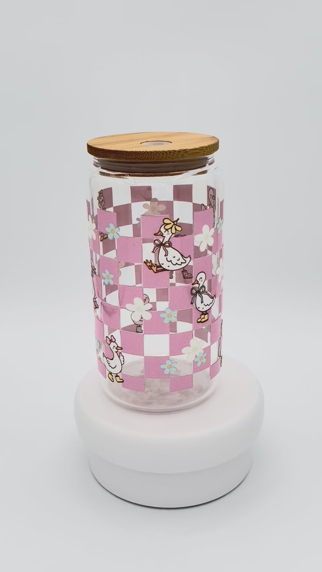 Will include ONE 16-ounce glass can cup (3-inch diameter x 5.25-inch height) with bamboo lid and plastic straw. The bamboo lid for the glass includes a silicone sleeve, which seals the glasses and prevents leaks or spills. The lids make it easy to take your drink on the go :)