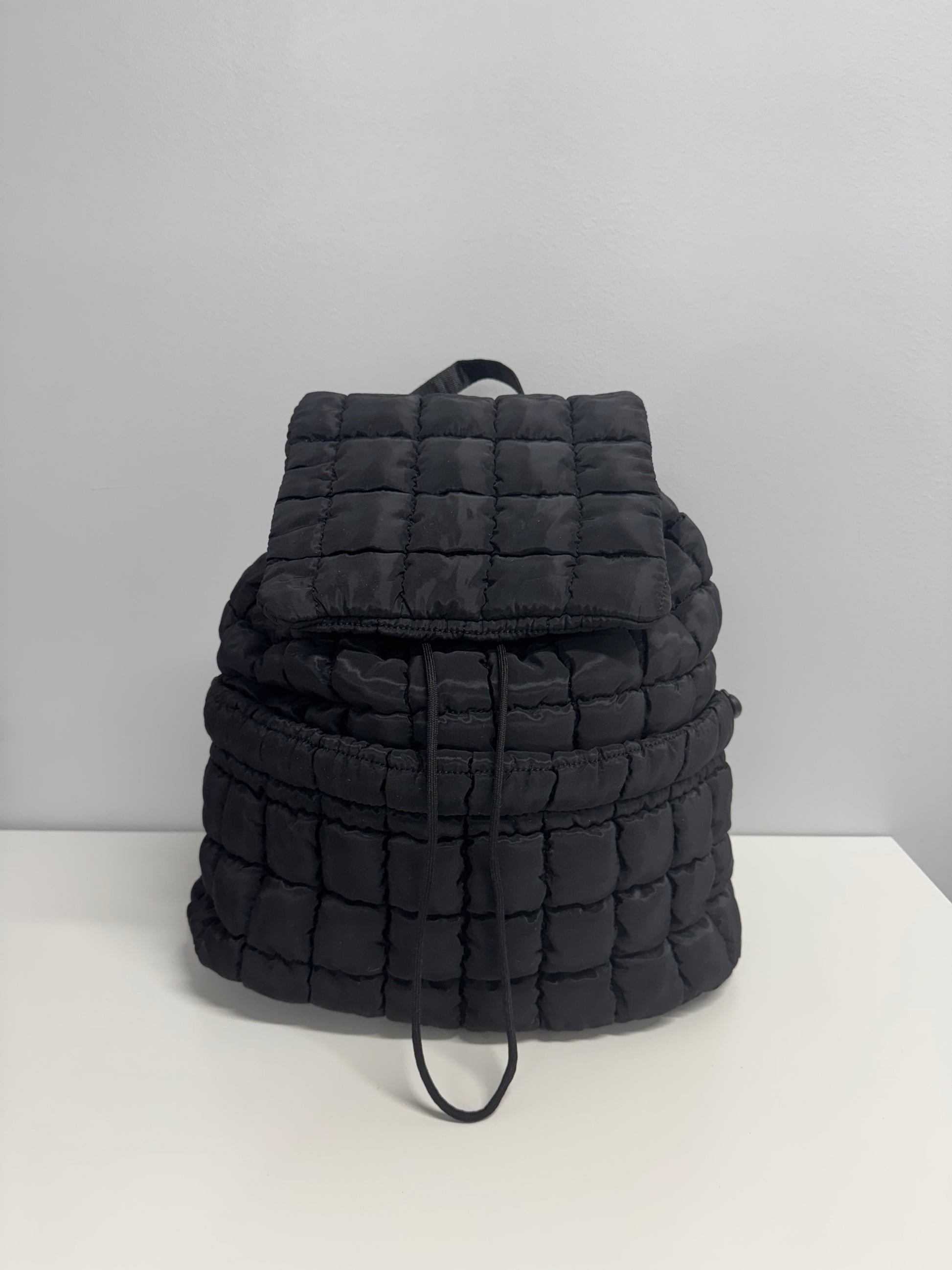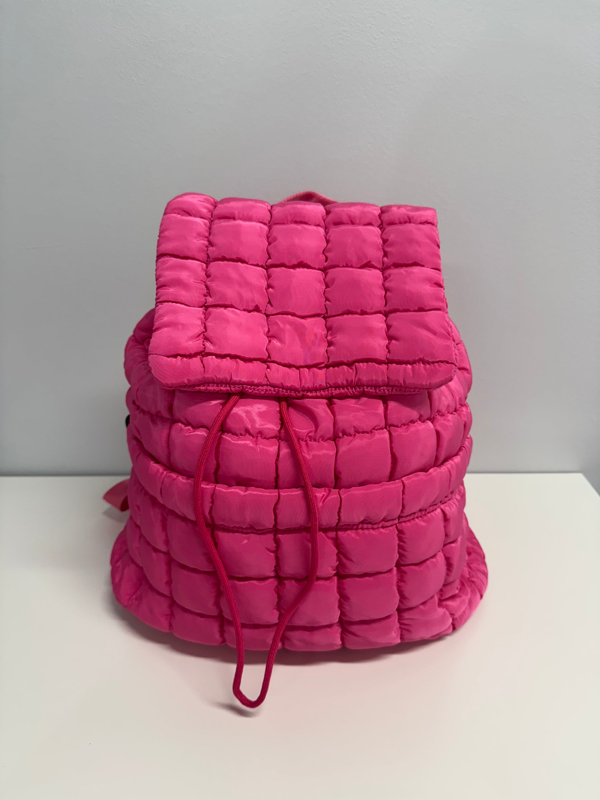 Quilted puffer backpack purse with drawstring closure. Available in 8 colors. 13.78 in x 5.12 in x 13.39 in