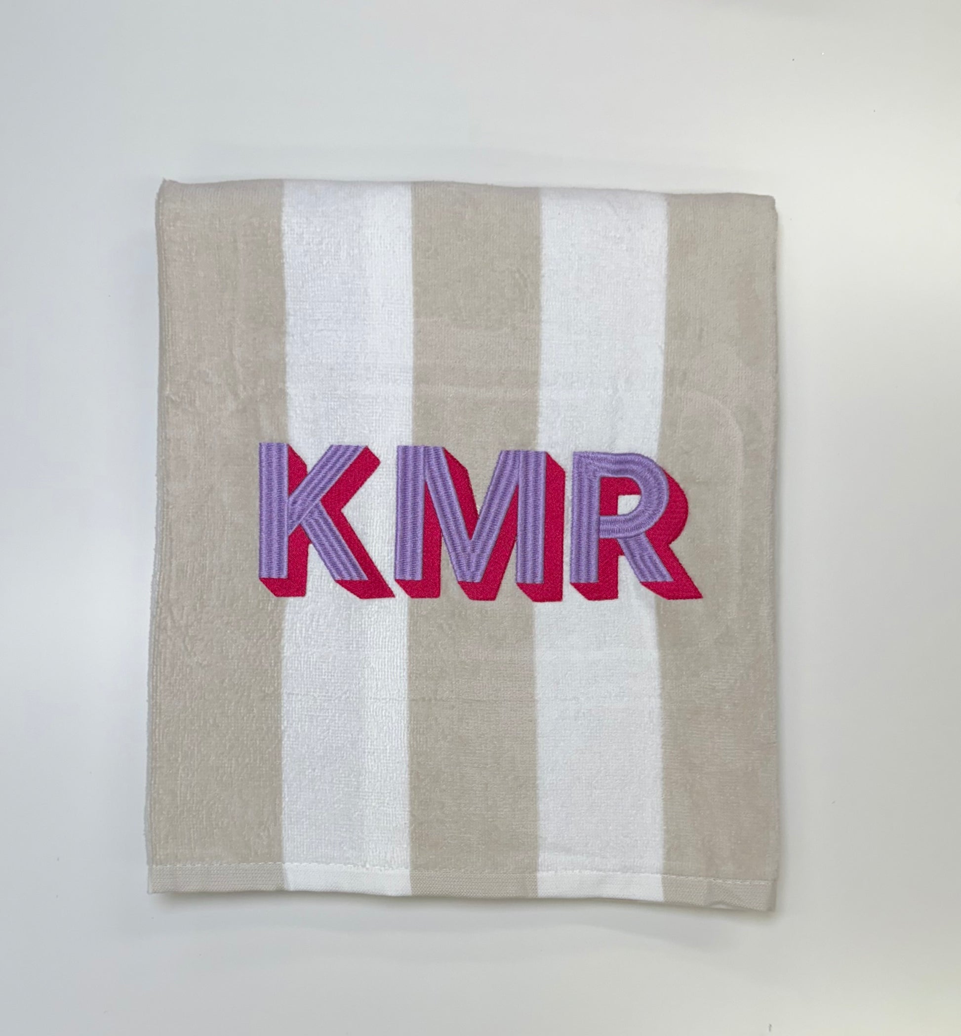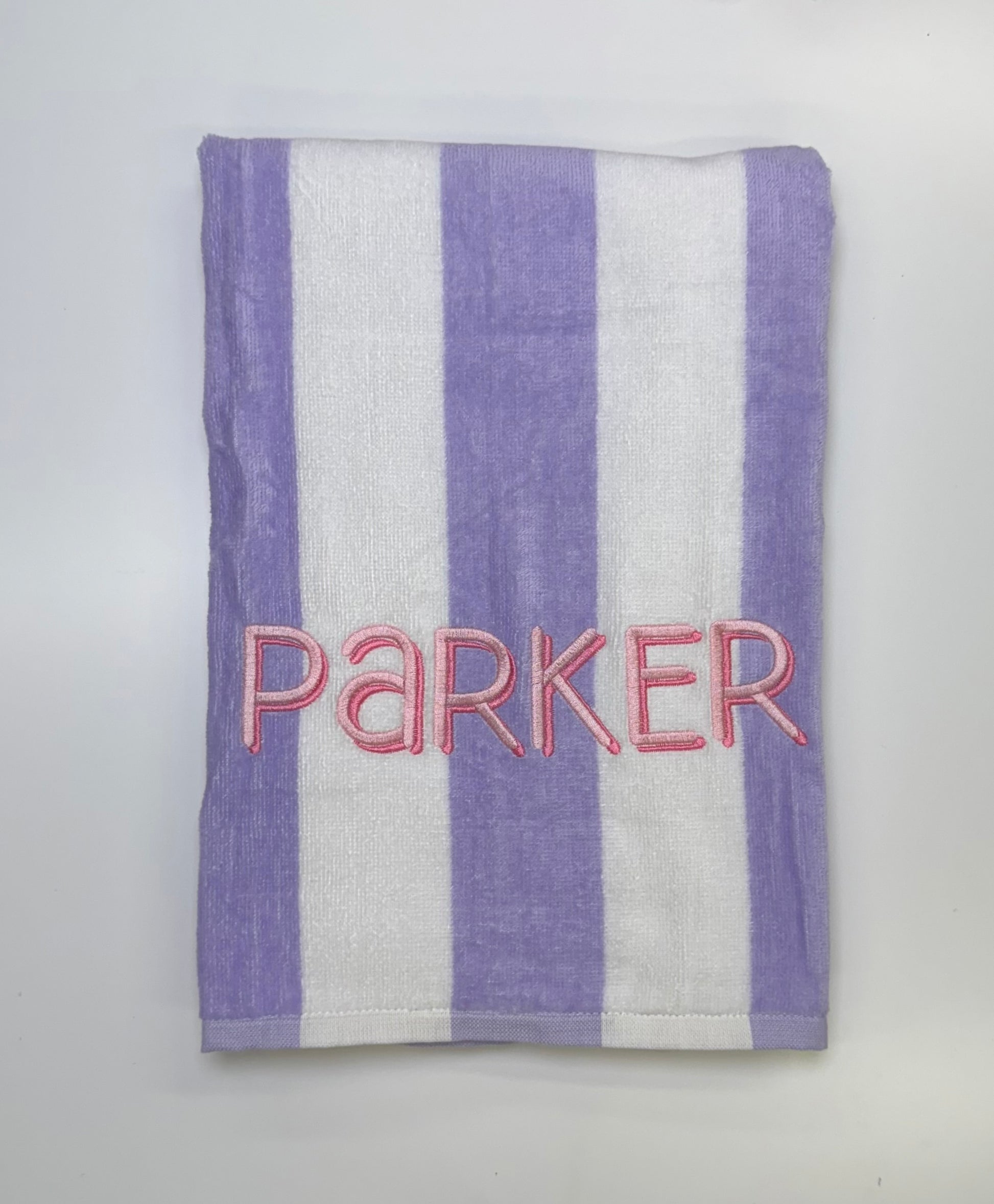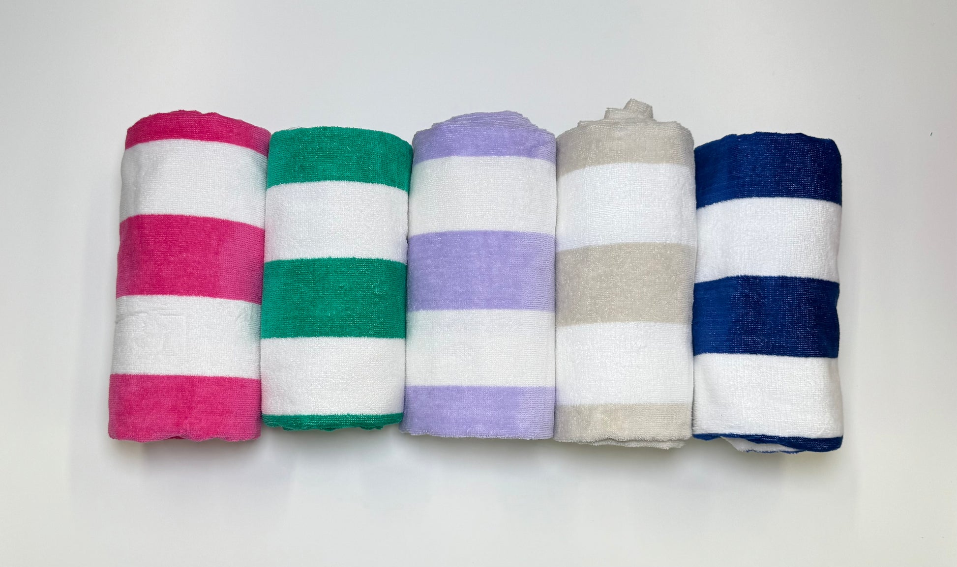 Striped towels are 58”x28” and the available colors are tan, navy blue, lilac, hot pink and green.