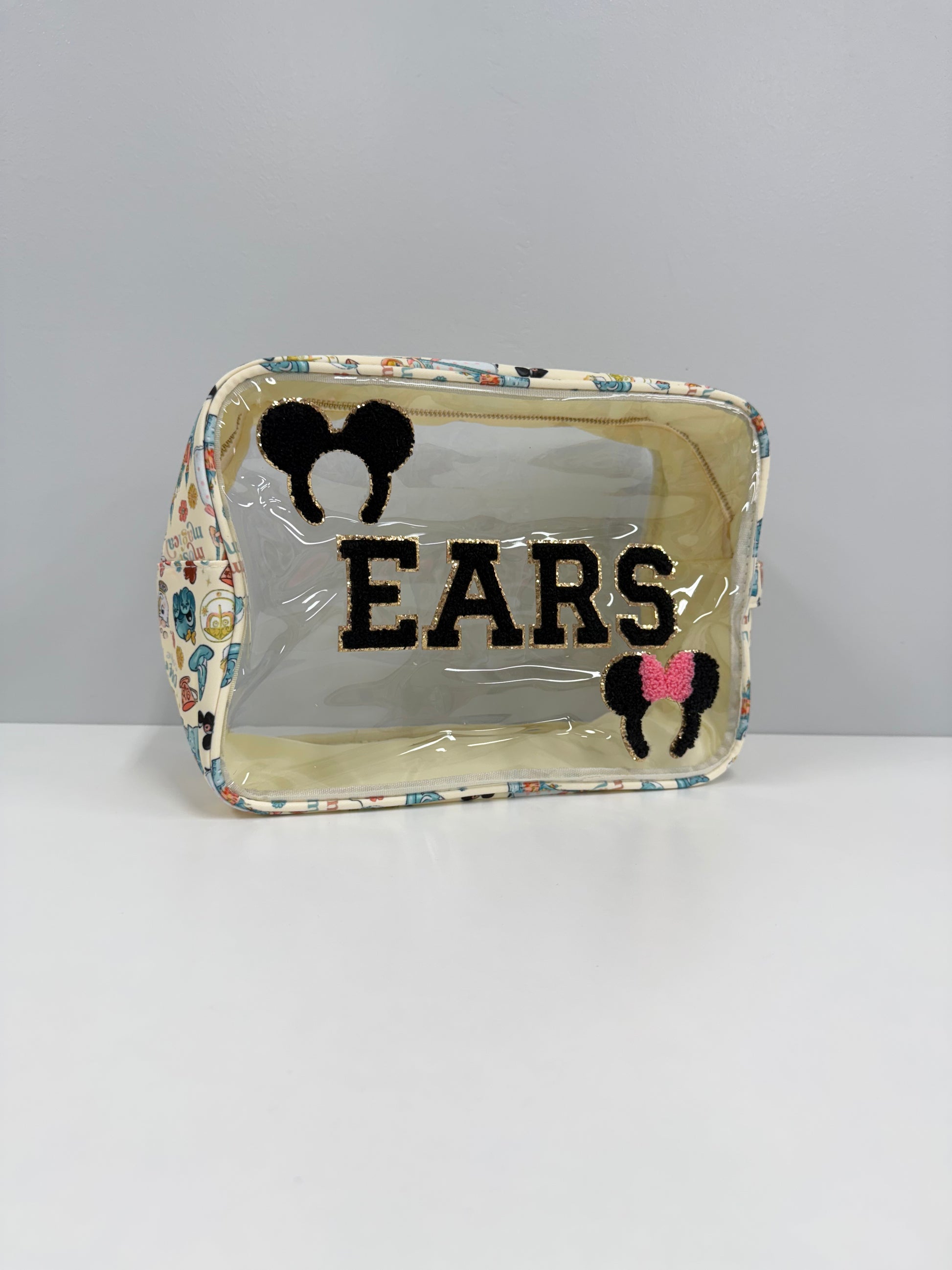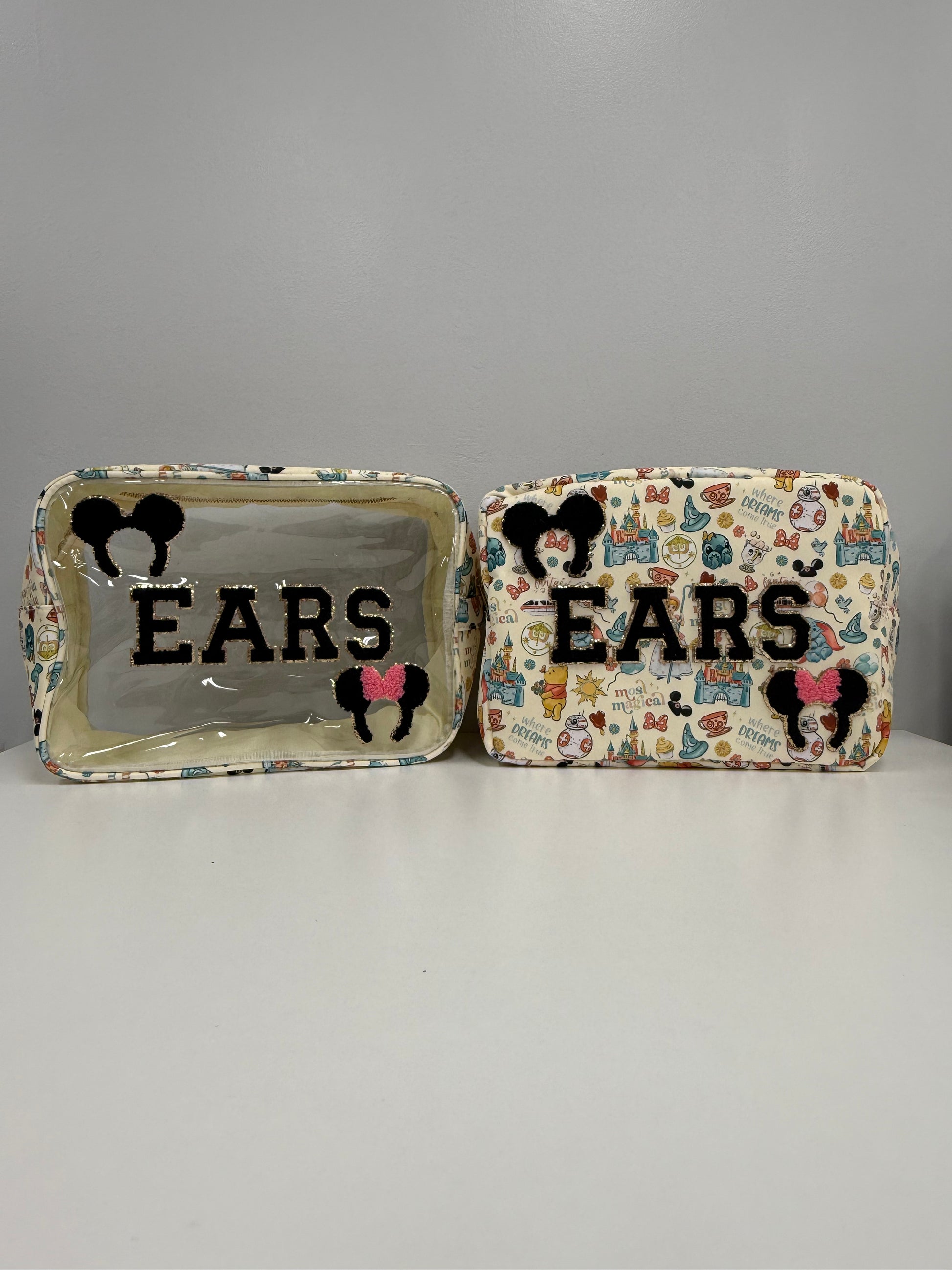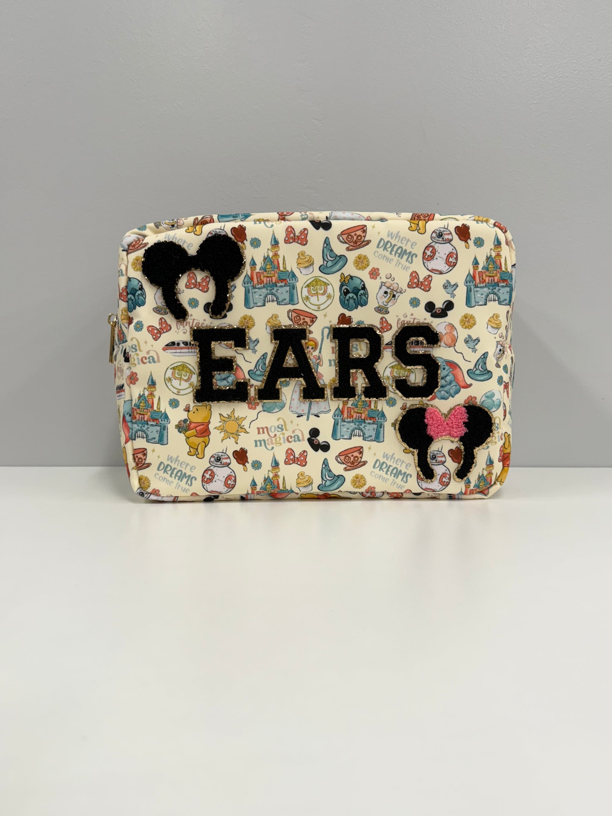 Listing is for one EXTRA LARGE (10.5” x 7.5” x 4.5”) nylon bag. Bag will come with 4 letter patches EARS, 1 mouse headband patch and 1 mouse with bow headband patch.