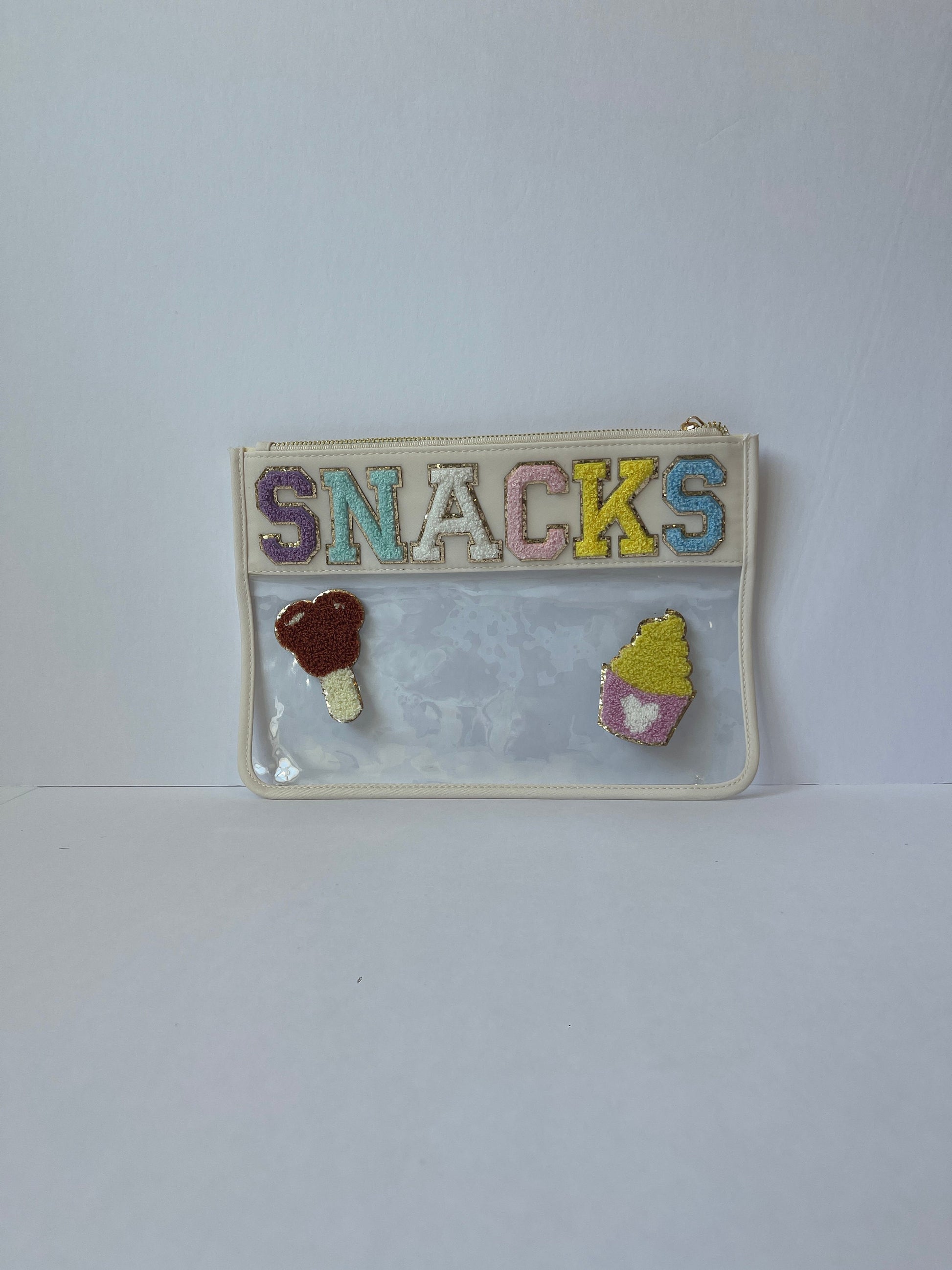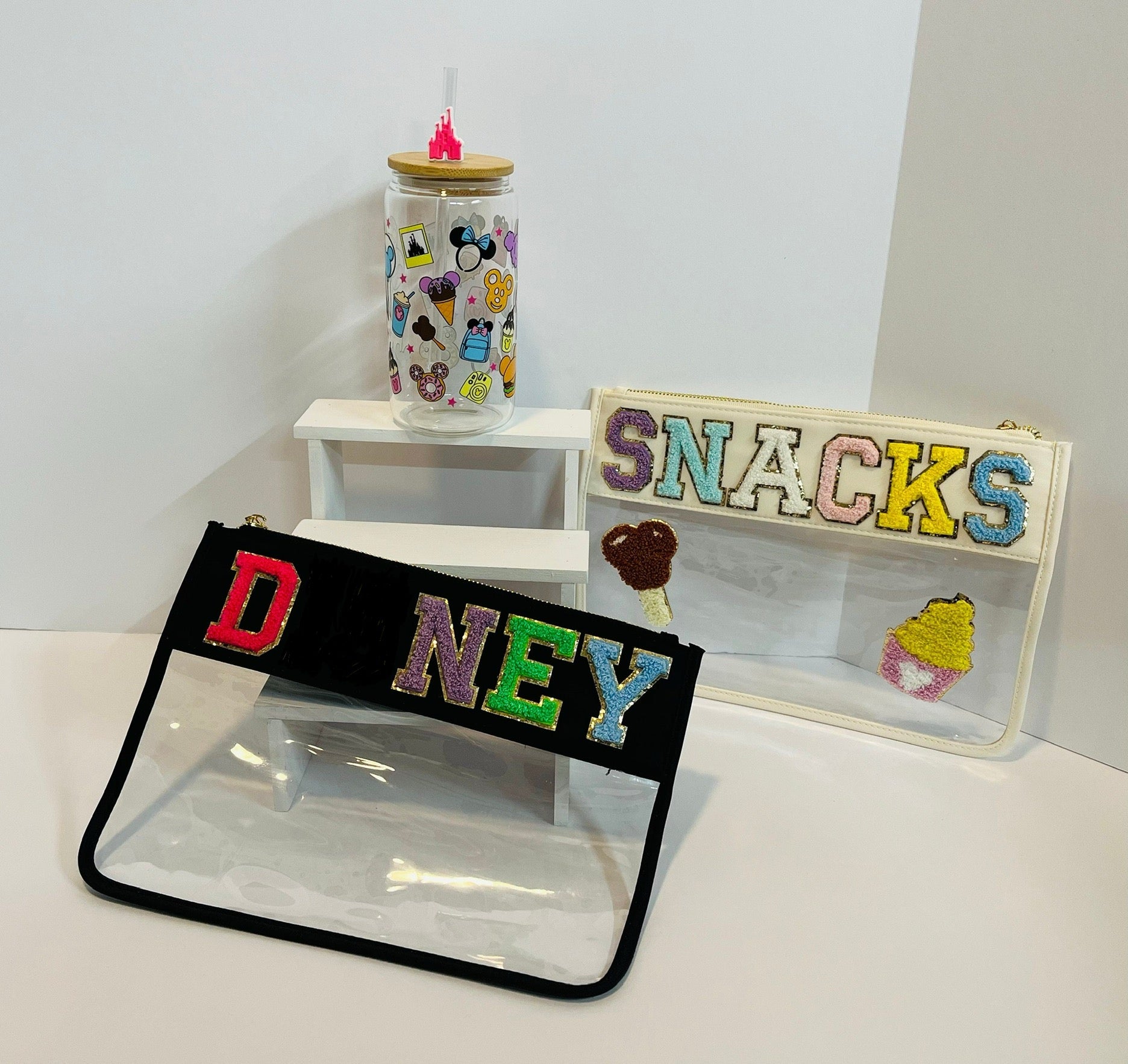 Nylon clear bags with patches to say either DISNEY or SNACKS (SNACKS bag includes two Mouse dessert patches). These are the perfect gift for yourself of loved ones.