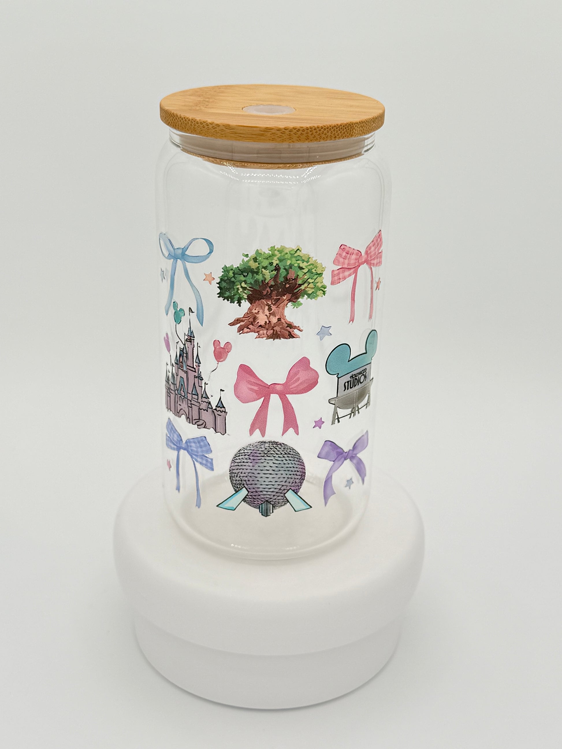 Will include ONE 16-ounce glass can cup (3-inch diameter x 5.25-inch height) with bamboo lid and plastic straw. The bamboo lid for the glass includes a silicone sleeve, which seals the glasses and prevents leaks or spills. The lids make it easy to take your drink on the go :)