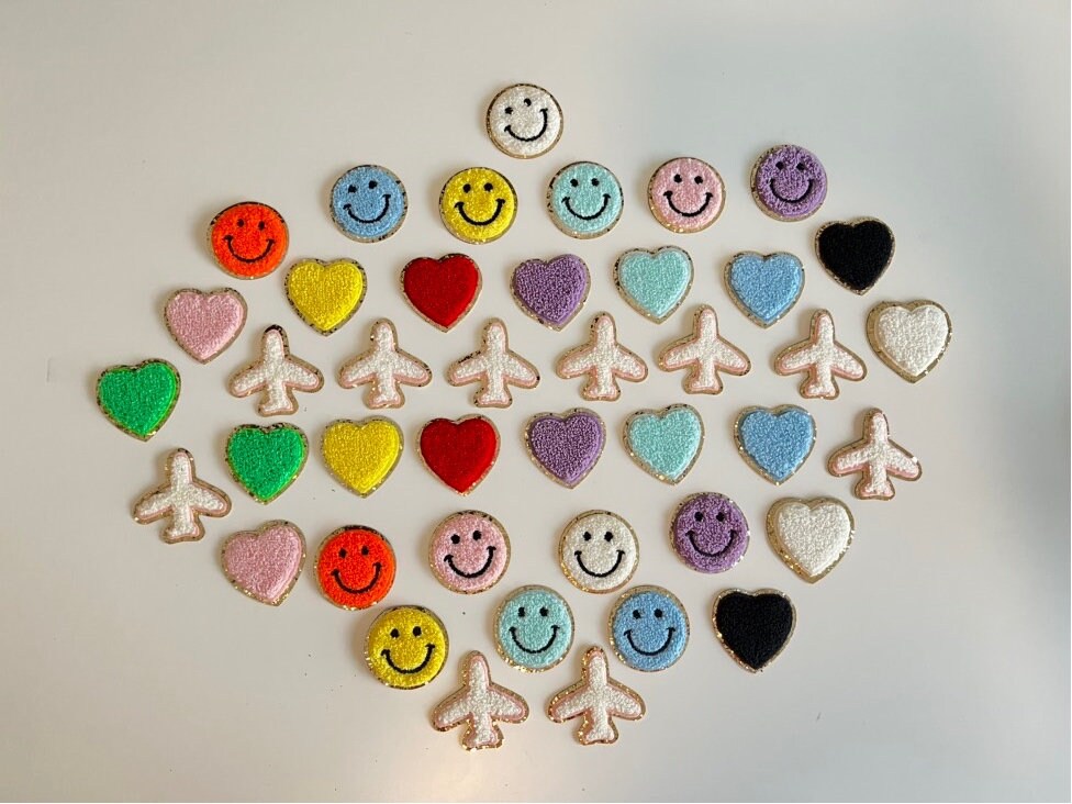 Chenille letter patches (2 inch) and are available white, light pink, hot pink, light blue, mint, purple, yellow, black, neon orange, red, green.