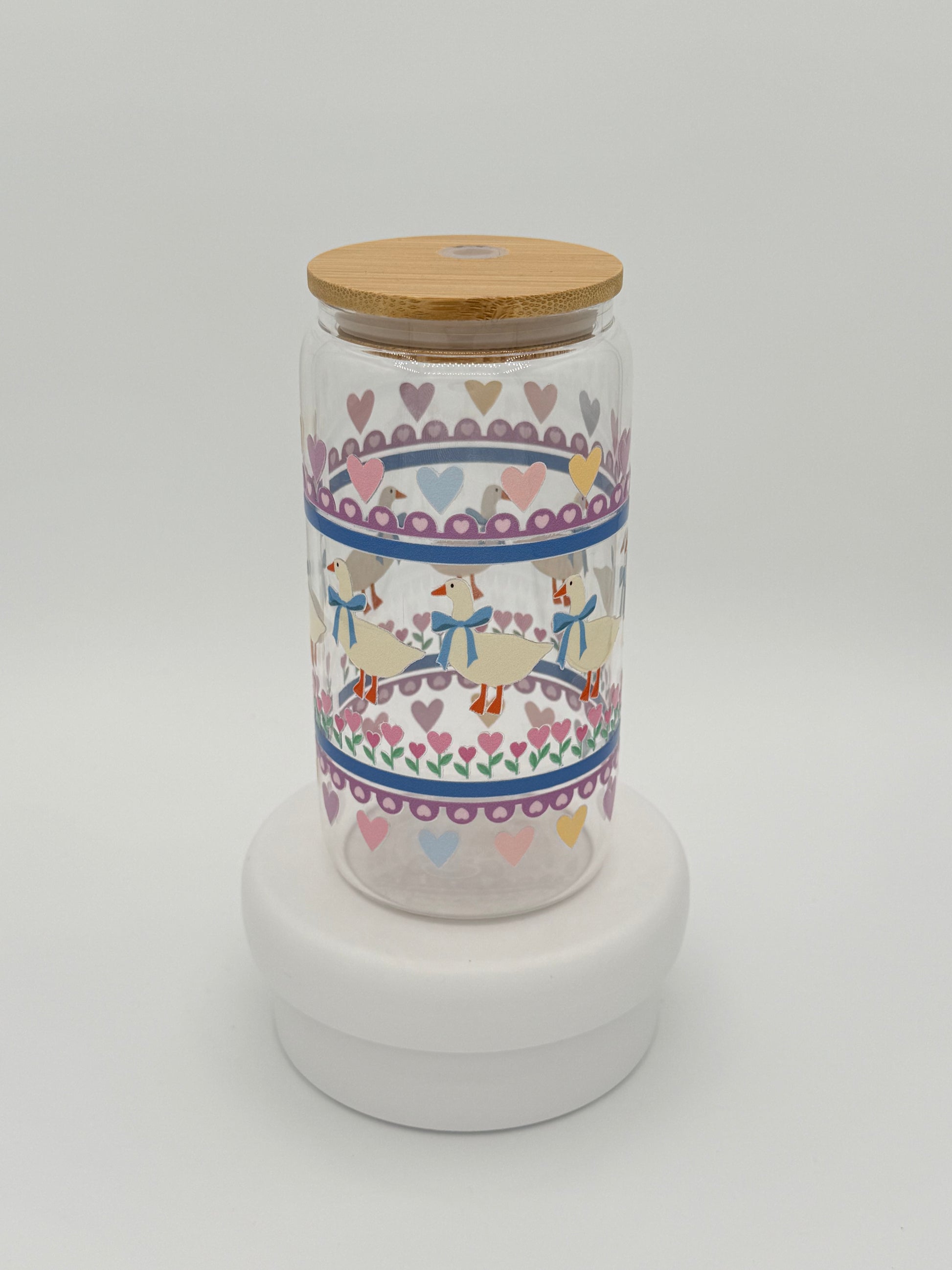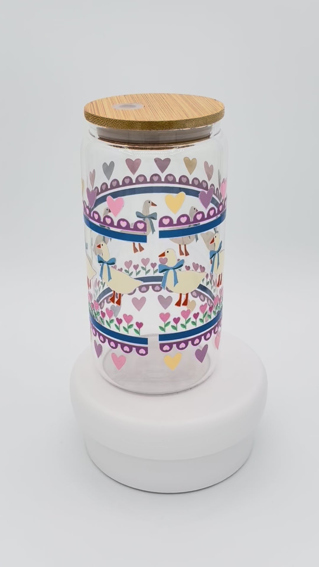 Will include ONE 16-ounce glass can cup (3-inch diameter x 5.25-inch height) with bamboo lid and plastic straw. The bamboo lid for the glass includes a silicone sleeve, which seals the glasses and prevents leaks or spills. The lids make it easy to take your drink on the go :)