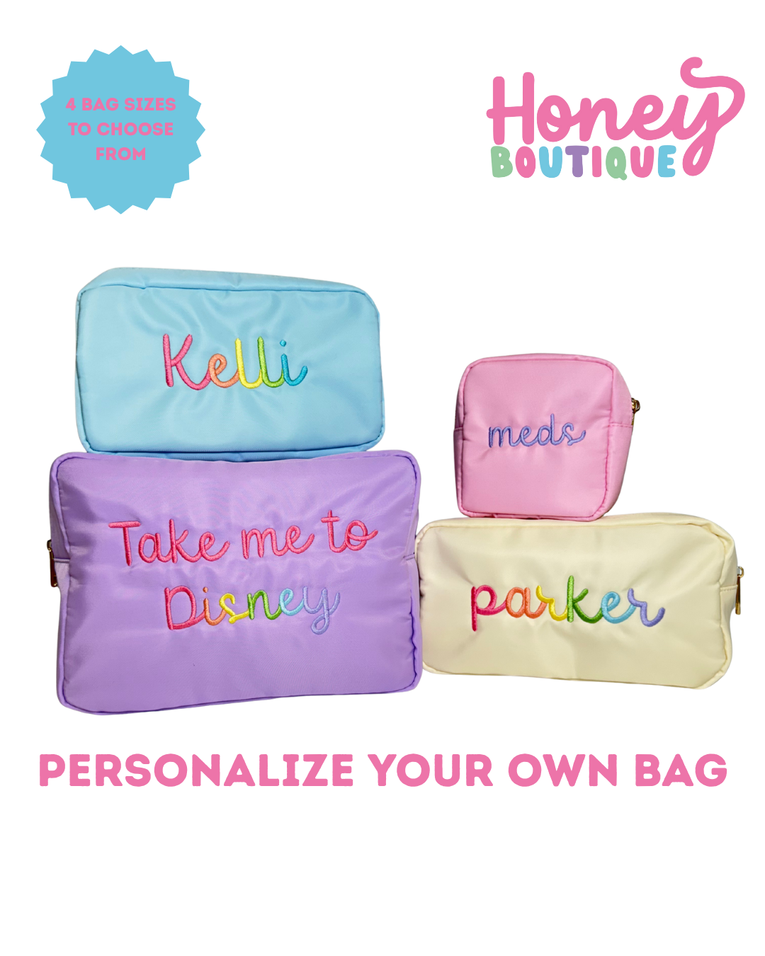 Listing is for one nylon bag (your choice or size and color). The bags can personalized with the wording of your choice