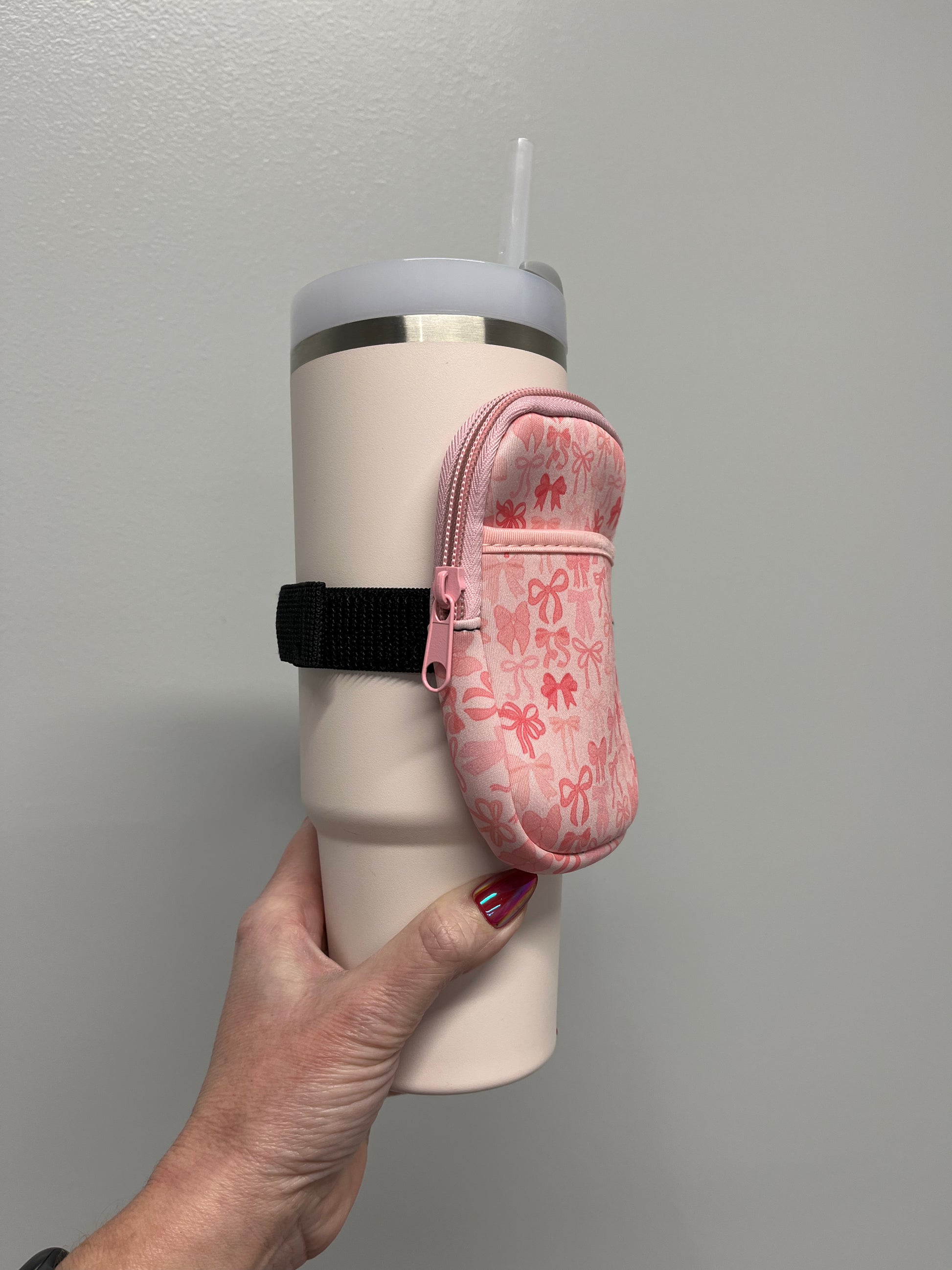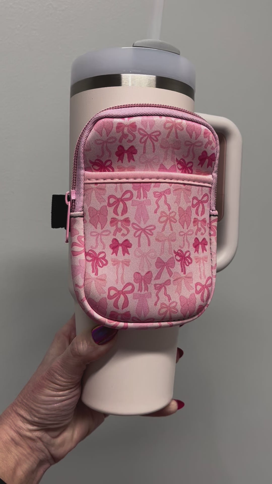 This nylon tumbler bag is perfect for storing money, cards, lip gloss, chapstick, etc. It has a slide-in pocket and a zipper pocket. It has an adjustable Velcro strap to fit any size/brand tumbler.